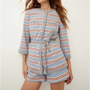 Veronica Beard Wyatt Women's Beige Striped Knit Sun-Faded Pastel Stretch Short-Sleeve Cropped Jacket